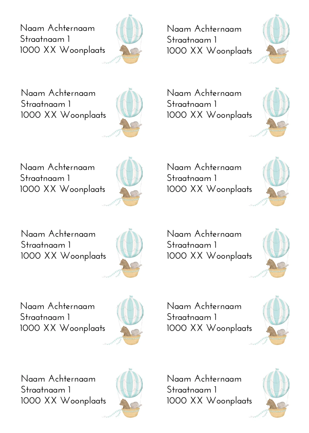Adresetiket met illustratie van een beertje en een olifantje in een blauwe luchtballon.