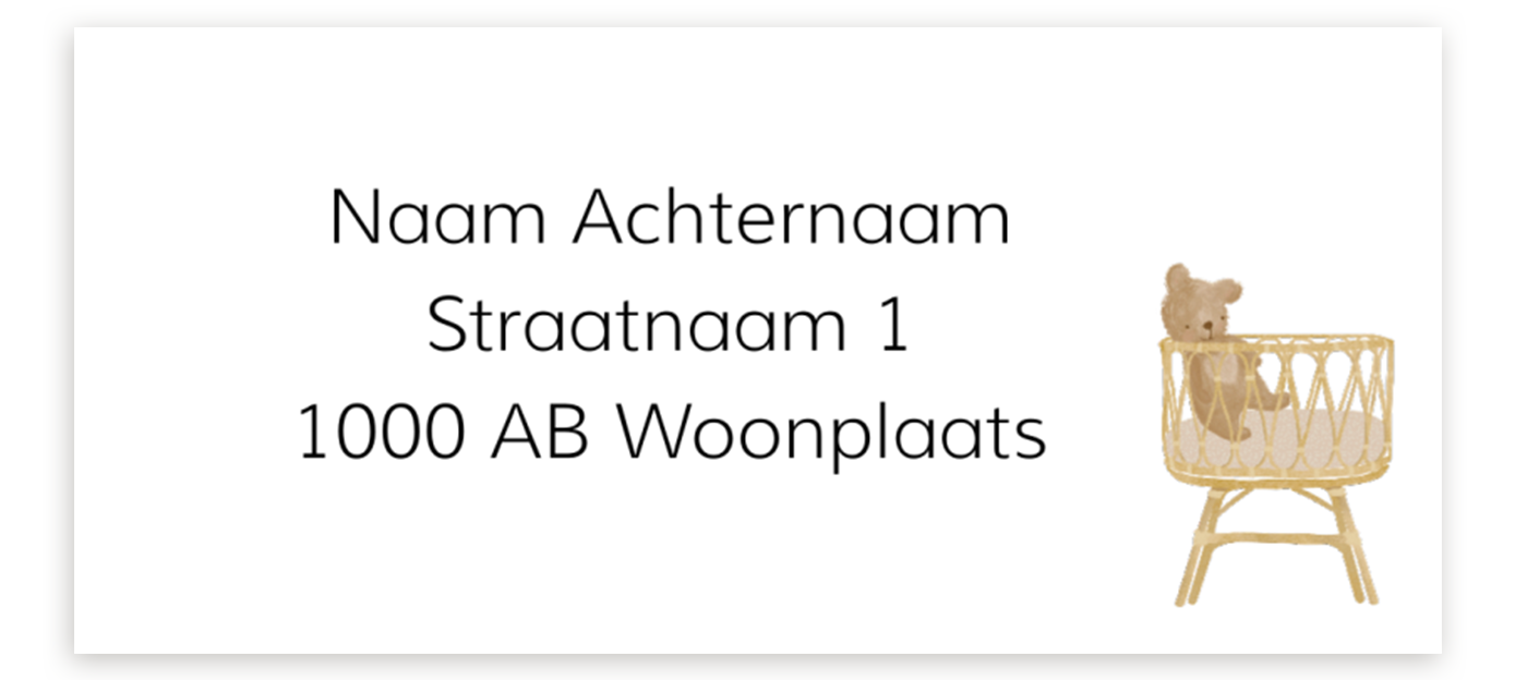 Met een adresetiket in de stijl van je geboortekaart maak je de envelop helemaal af! Je kunt voor elke sticker een uniek adres invullen. Wil je een ander design? Geen probleem, pas het eenvoudig aan in de editor. Elke vel bevat twaalf adresstickers