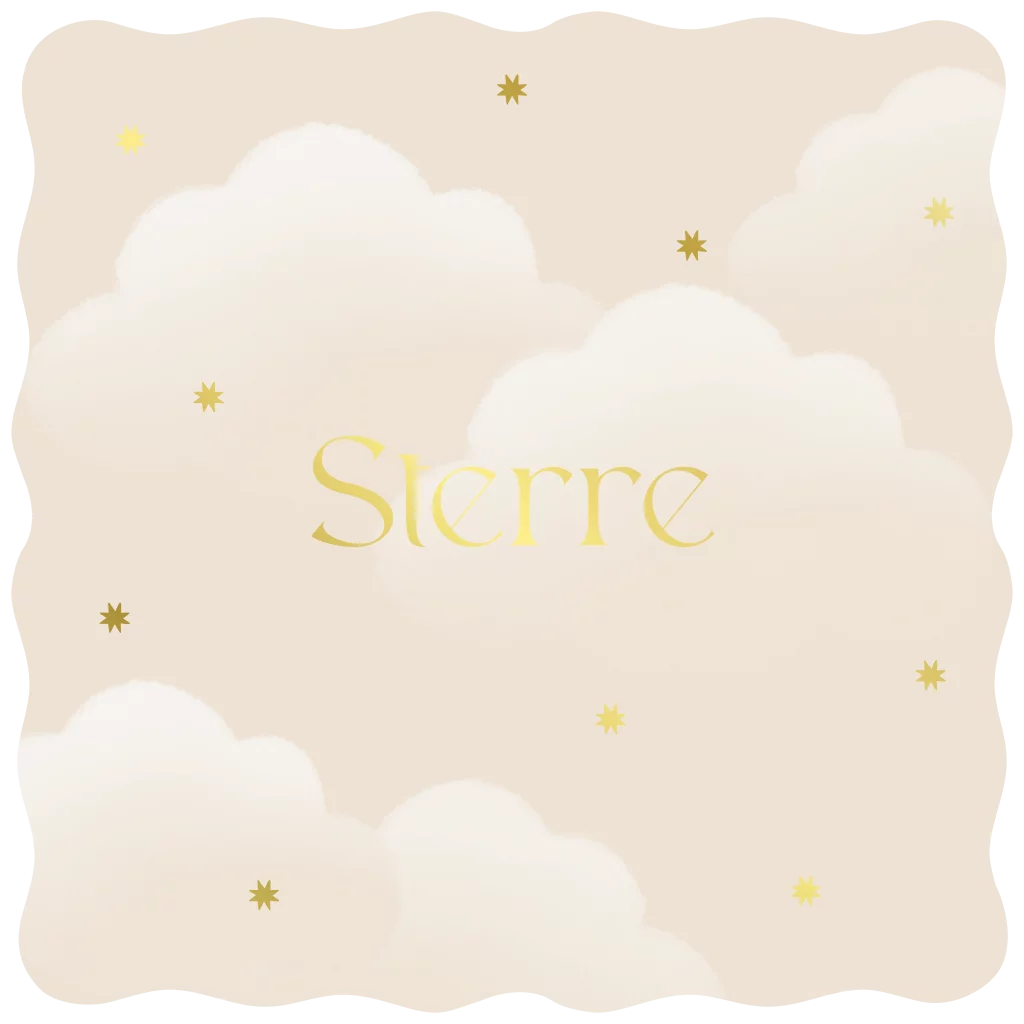 Apart geboortekaartje met originele stansvorm met golfjes. Dromerig en lief kaartje met zachte wolken en sprankelende sterretjes. - Sterre -