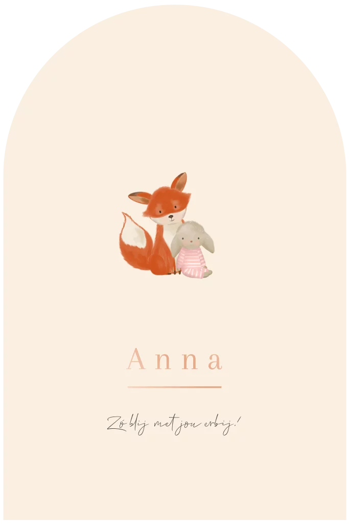 Lief dieren geboortekaartje met originele boogvorm. Een schattige illustratie van een vosje met een konijntje op een beige achtergrond. De naam is uitgevoerd in roséfolie. Via de editor kun je het ontwerp en de kleuren eenvoudig aanpassen. - Anna -
