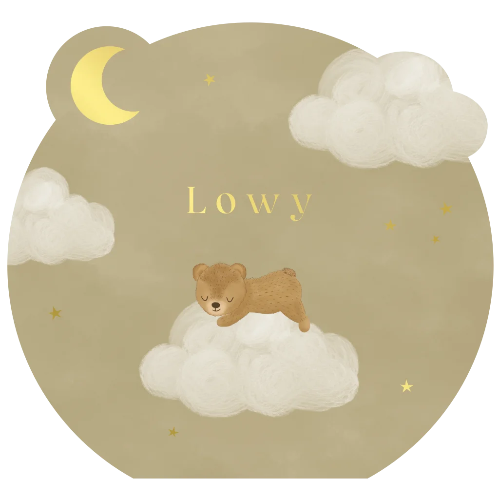 Geboortekaartje met bijzondere vorm en een lief slapend beertje op een wolk omringd door sprankelende sterretjes. De goudfolie elementen maken dit dromerige kaartje helemaal af! - Lowy -