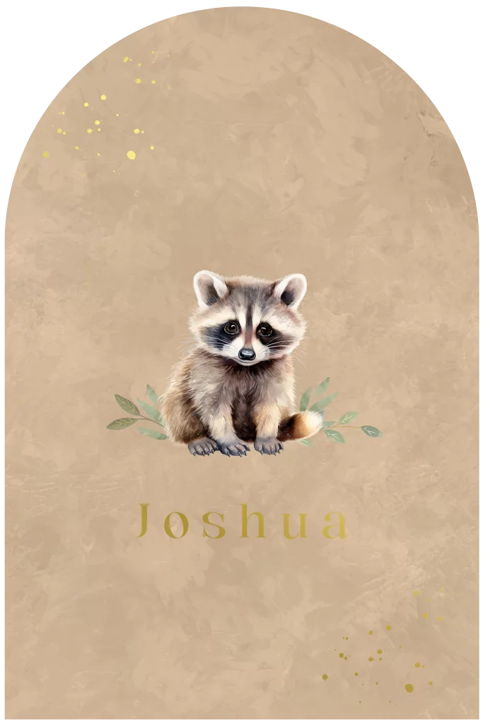 Lief geboortekaartje in originele boogvorm. Achtergrond in mooie bruintint met structuur en illustratie van kleine wasbeer. - Joshua -