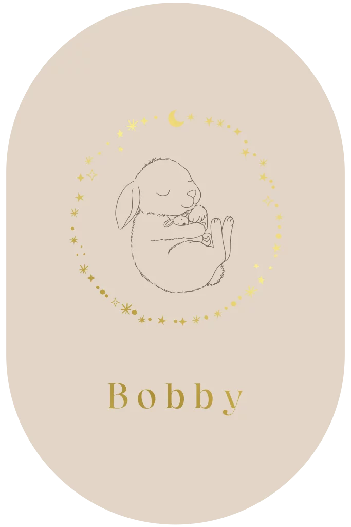 Lief geboortekaartje met lijntekening van slapend konijntje met een knuffeltje in zijn armen. De sprankelende goudfolie sterretjes en maantje geven dit kaartje een magisch accent. Liever een ander formaat? Laat het ons weten, dan zetten we het formaat voor je om. - Bobby -