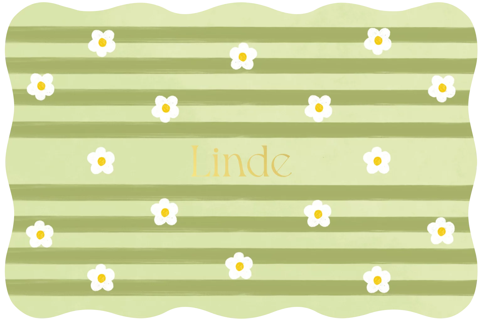 Vrolijk geboortekaartje voor een meisje met bijzondere rechthoekige vorm met gegolfde rand. Frisgroene achtergrond met streepjes patroon en vrolijke witte bloemetjes. - Linde -