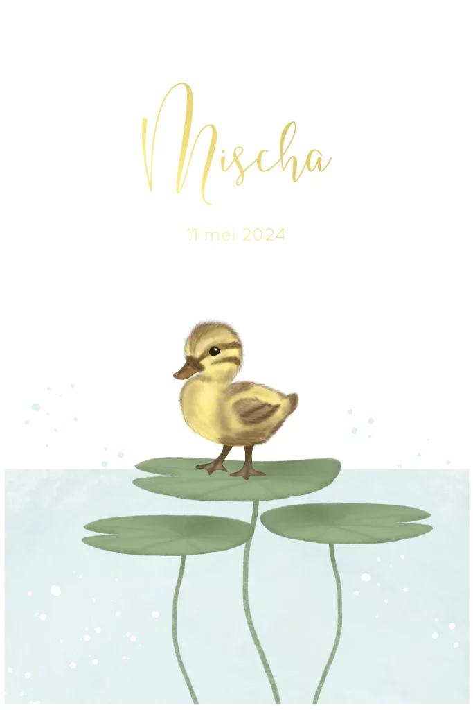 Lief geboortekaartje in originele boogvorm. De illustratie van het kleine eendje op de leliebladeren is zó cute! De naam en de datum zijn bij dit design in goudfolie uitgevoerd, maar natuurlijk kan je zelf voor een andere (folie-) kleur kiezen via de editor. Wij zijn verliefd op dit kaartje die zowel voor een jongen als een meisje kan! - Mischa -