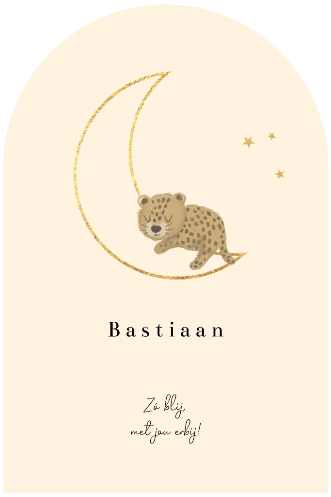 Lief geboortekaartje voor een jongen. Originele boogvorm met daarop de maan in goudkleur en een slapend pantertje. Op de achterzijde komt de maan en de sprankelende gouden sterretjes weer terug. Natuurlijk is ook dit kaartje helemaal naar wens aan te passen met onze handige editor. - Bastiaan -