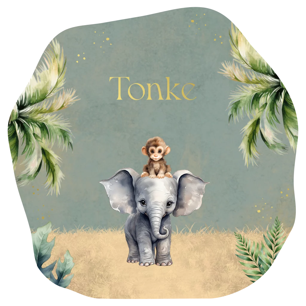 Geboortekaartje in organische vorm met junglethema. Lieve illustratie van een olifantje met een aapje, de goudfolie zorgt voor een sprankelende touch. - Tonke -
