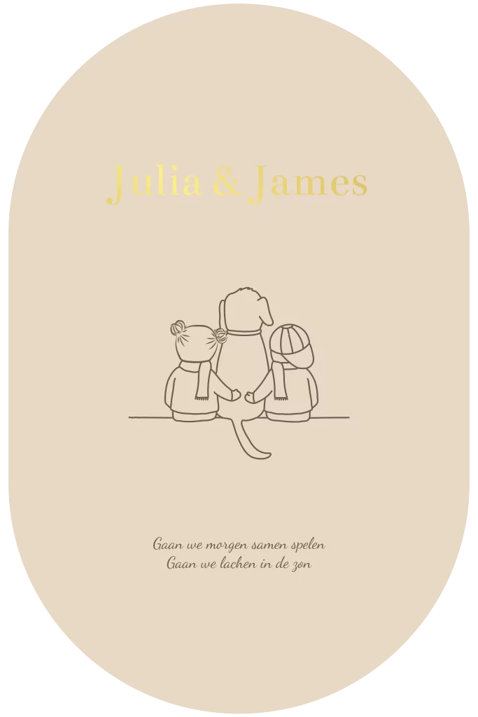 Geboortekaartje voor een tweeling zoon en dochter. Lijntekening van een kleine jongen en meisje met een hond en de namen in goudfolie. - Julia en James -