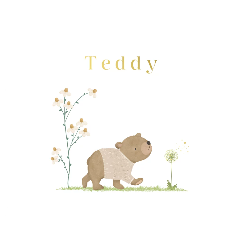 Origineel geboortekaartje in vierkante vorm met gegolfde randen. Lieve illustratie van een beertje en de naam in goudfolie. Door de neutrale kleuren kan dit kaartje zowel voor een jongen als voor een meisje. - Teddy -