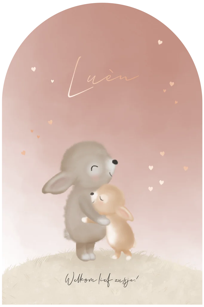 Lief geboortekaartje voor een zusje. Illustratie van twee kleine konijntjes die elkaar knuffelen, zó lief! De naam en de kleine hartjes op de voorzijde zijn uitgevoerd in roséfolie. - Luen -