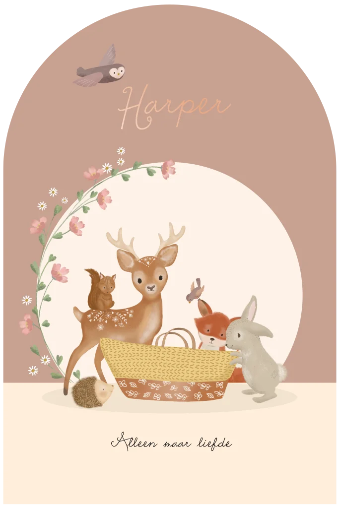 Geboortekaartje voor een meisje in mooie naturel tinten en illustraties van bosdieren en bloemen. De kaart is opgemaakt met losse illustraties dus je kunt deze helemaal naar wens aanpassen. De naam van jullie kindje in roséfolie maakt dit kaartje extra feestelijk! - Harper -