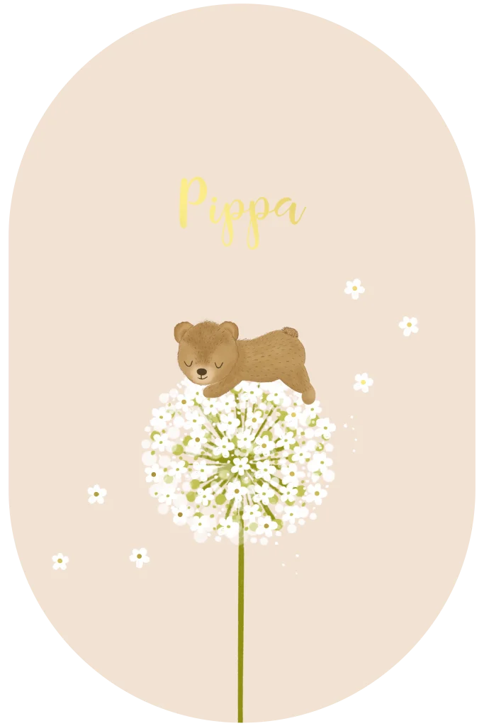 Lief geboortekaartje voor een meisje met pluisbloem en daarop een slapend beertje. Een lief en eenvoudig kaartje waarbij de goudfolie voor nét dat beetje extra zorgt.