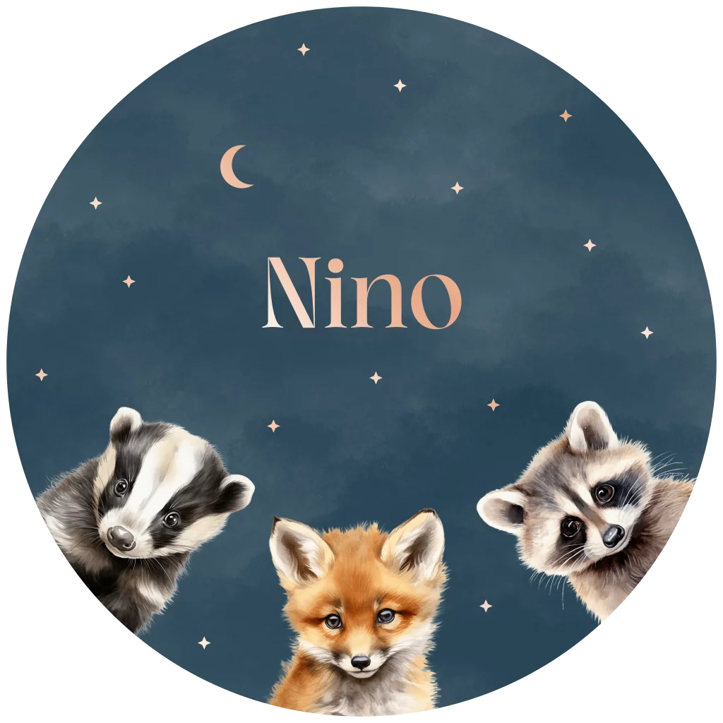 Origineel geboortekaartje in ronde vorm. Nachtblauwe achtergrond met daarop illustraties van bosdieren en sprankelende sterretjes in roséfolie. Ook de naam van jullie kindje in roséfolie. - Nino -