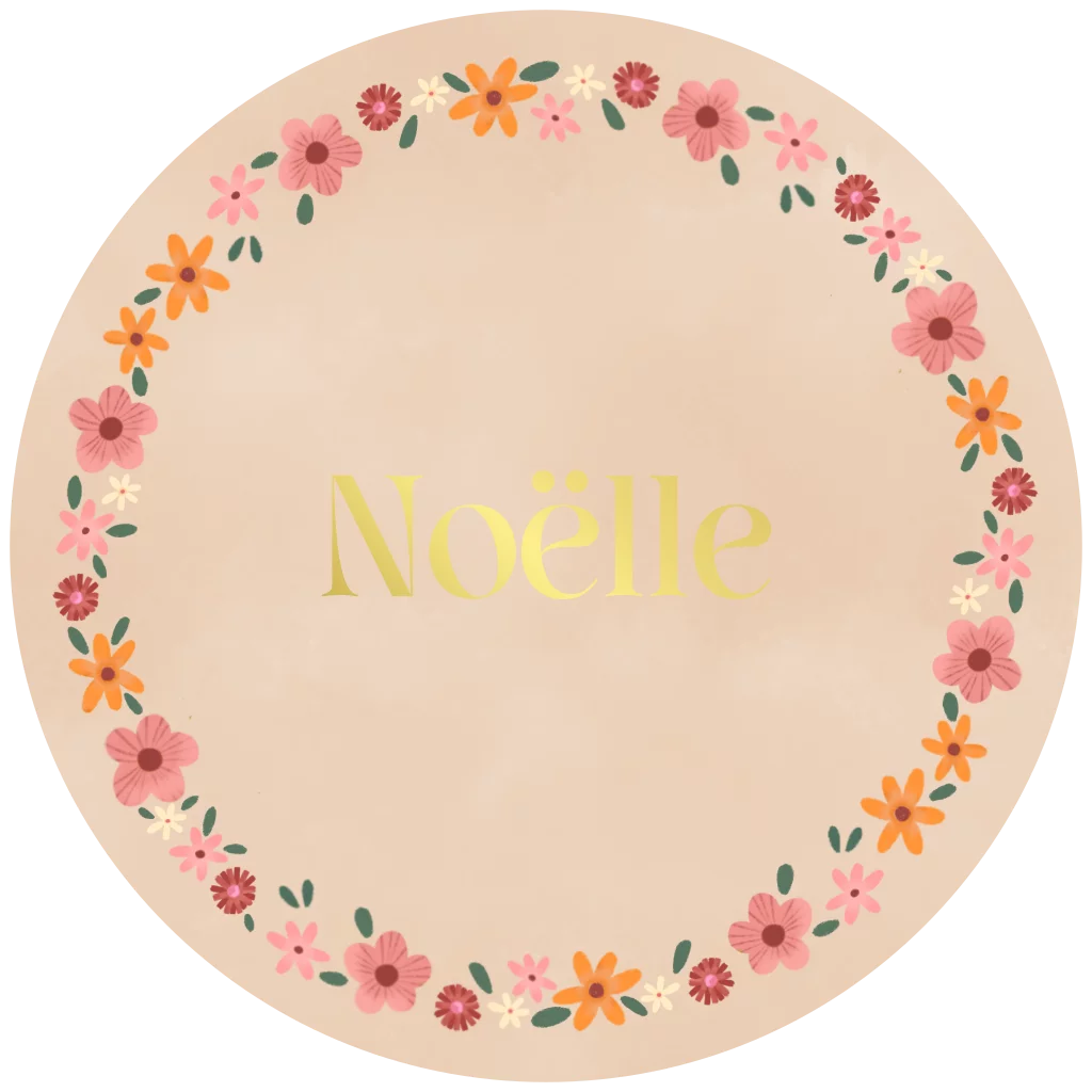 Rond geboortekaartje met zandkleurige watercolor achtergrond. Een uniek en kleurrijk geboortekaartje met bloemen voor een meisje. De naam is uitgevoerd in goudfolie en wordt omringd door vrolijke bloemetjes. Natuurlijk kun je dit hippe geboortekaartje ook helemaal naar eigen smaak aanpassen! - Noelle -