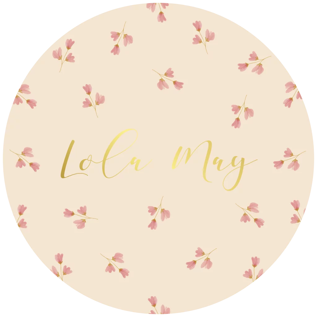 Lief rond geboortekaartje voor een meisje met lief bloemenpatroon en de naam in goudfolie. Het bloemenpatroon is opgebouwd uit losse elementen, dus deze kun je verplaatsen als dit bijvoorbeeld beter uitkomt met jullie naam.