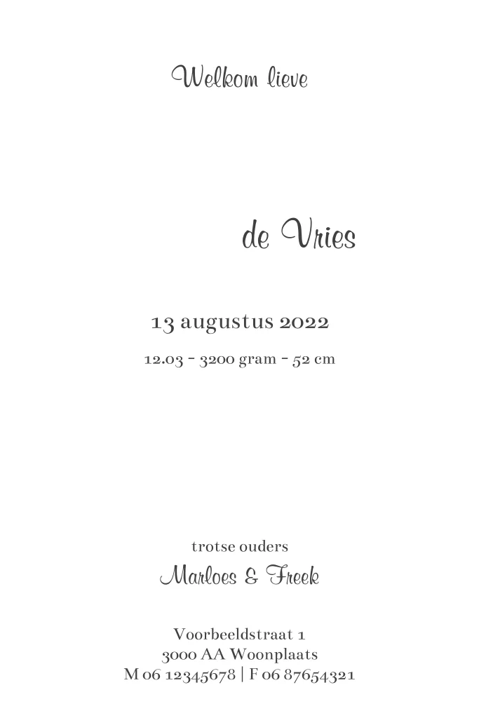 Klassiek geboortekaartje voor een jongen of een meisje. Op de voorzijde kleine babyvoetjes en de naam in goudfolie. Less is more! Natuurlijk kun je ook voor een andere foliekleur kiezen via de editor. Ook de binnenzijde van het kaartje heeft een rustige cleane opmaak met een klassieke uitstraling. - Senna -