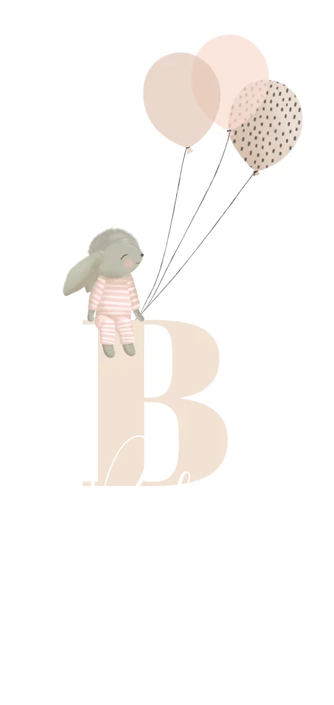 Lief folie geboortekaartje voor een meisje, met een schattig konijntje zittend op de voorletter van de naam. De ballonnen geven dit kaartje een extra feestelijk tintje.