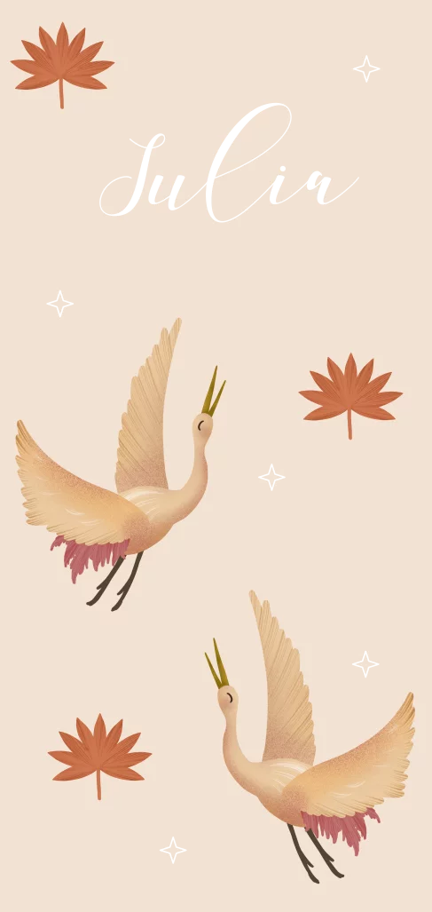 Stijlvol en trendy geboortekaartje met twee sierlijke kraanvogels. De naam en sterretjes in goudfolie combineren prachtig met de kleuren van dit kaartje.