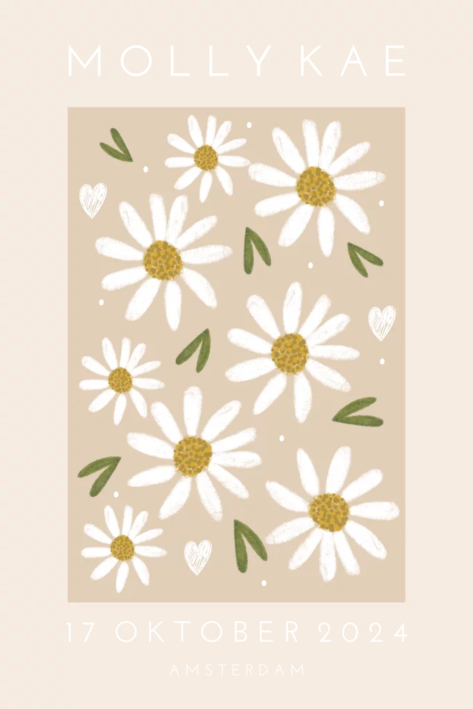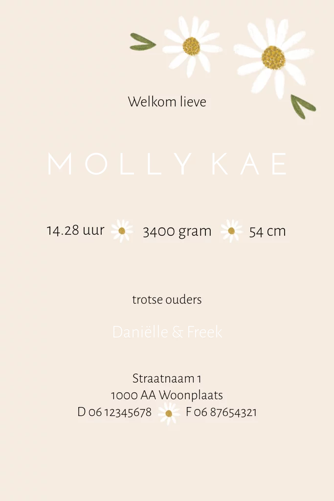 Geboortekaartje voor een meisje waar je vrolijk van wordt! Een patroon van witte margrietjes, blaadjes en hartjes en goudfolie stipjes. De plaatsing van de naam en de geboortedatum is nét even anders en geven dit kaartje een originele en eigentijdse uitstraling. - Molly Kae -
