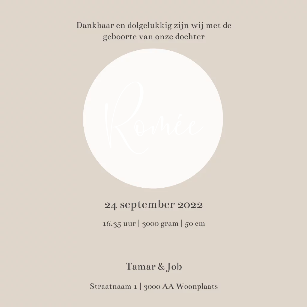 Hip goudfolie geboortekaartje voor een meisje met speelse cirkels en naam in goudfolie. Bij dit ontwerp is gekozen voor een zandkleurige achtergrond. Via de editor kun je de achtergrondkleur wijzigen in jouw favoriete kleur!