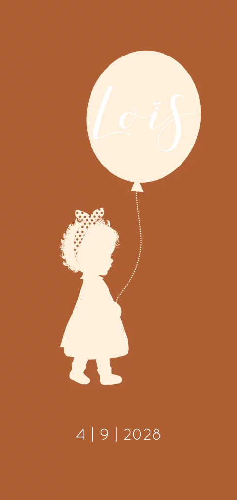 Lief goudfolie geboortekaartje voor een meisje. Trendy roestbruine achtergrondkleur met silhouet van meisje met haarband en ballon. In de ballon staat de naam van jullie kindje in goudfolie. De geboortedatum wordt ook gedrukt in goudfolie wat een mooi subtiel effect heeft op de roestbruine achtergrond.