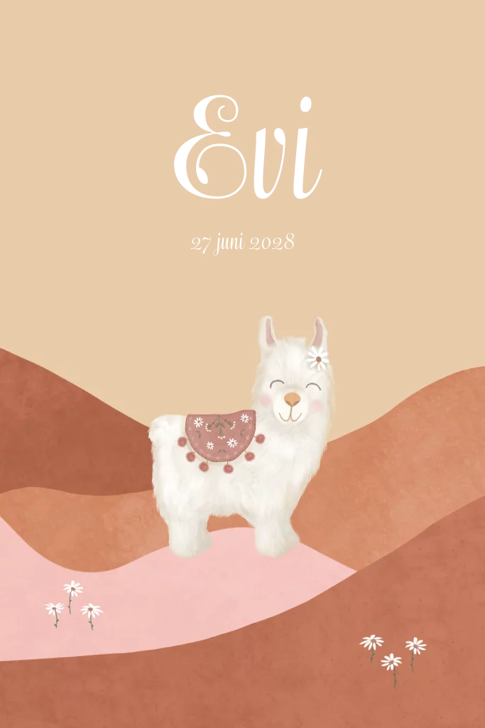 Vrolijk geboortekaartje voor een meisje met berglandschap in verschillende terra tinten en roze. Op de voorgrond een grappige witte lama en witte bloemetjes.