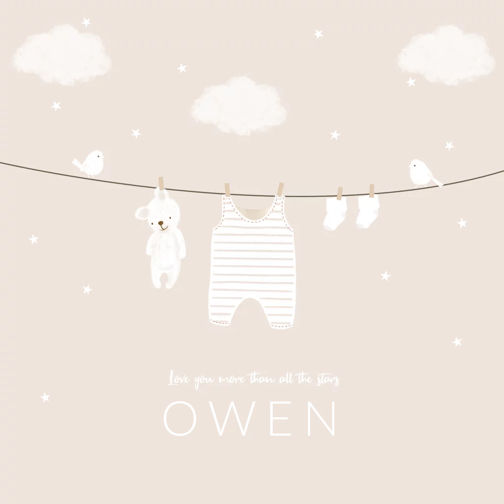 Lief goudfolie geboortekaartje voor een jongen. Zandkleurige achtergrond met waslijntje met wit babypakje, sokjes en een teddybeer. Op het waslijntje twee kleine witte vogeltjes. De wolkjes, sprankelende goudfolie sterretjes en de naam in goudfolie geven wit rustige kaartje een sprankelend effect.