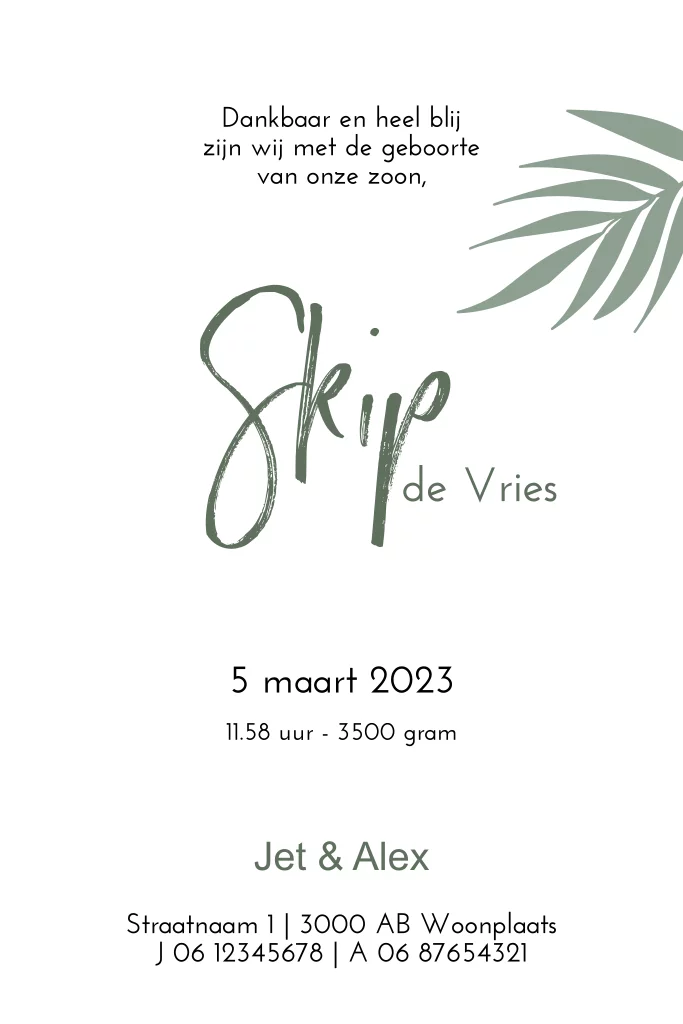 Hip geboortekaartje voor een jongen. Op de diepgroene achtergrond is een olifantje te zien die hartjes blaast. Het olifantje en de hartjes zijn uitgevoerd in goudfolie. De palmbladeren op de buiten- en binnenzijde van de kaart maken de jungle-look helemaal af! - Skip -
