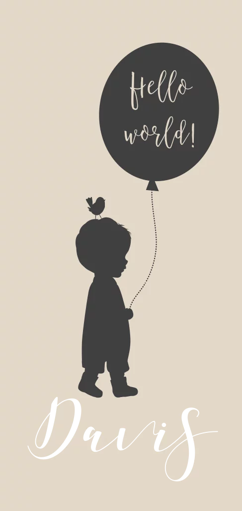 Goudfolie geboortekaartje voor een jongen met zandkleurige achtergrond en silhouet van een kleine jongen met een ballon. Op zijn hoofd een grappig vogeltje. De tekst in de ballon is "Hello world!". Wil je hier liever een andere leuke tekst, dan kun je dat eenvoudig aanpassen via de editor. De naam is in goudfolie en ook dit kun je via de editor aanpassen naar een andere foliekleur.