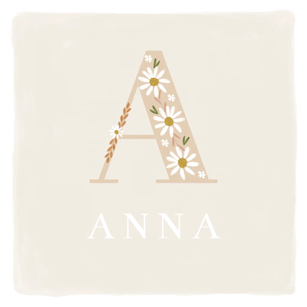Hip geboortekaartje voor een meisje in Boho-stijl. Zandkleurige achtergrond met verfstructuur en daarop de eerste letter van de naam versiert met madeliefjes en roestbruine takjes. De letter is aanpasbaar en de versieringen kun je via de editor verplaatsen.De naam in goudfolie geeft dit ontwerp nét dat beetje extra!