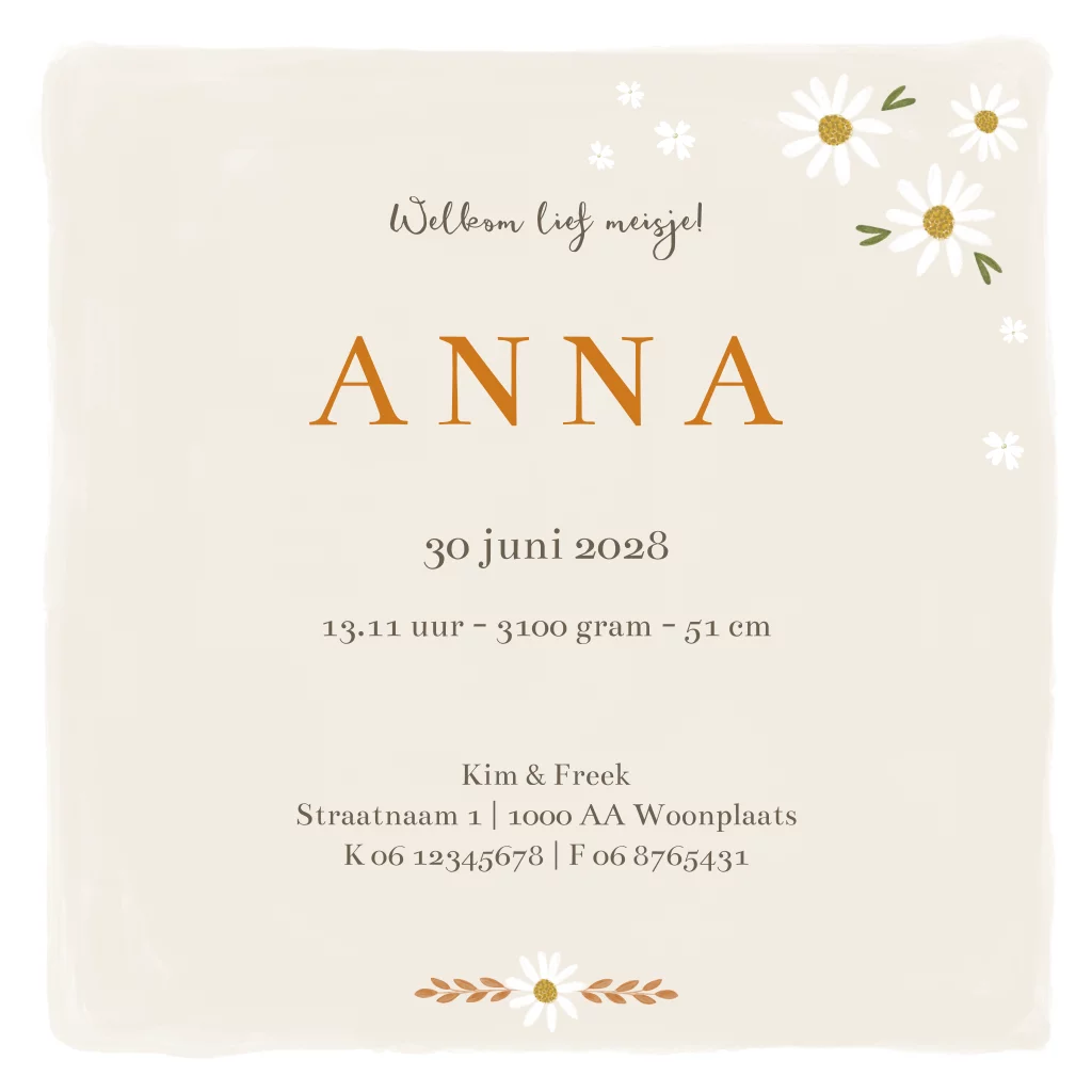 Boho geboortekaart voor een meisje met madeliefjes en folie