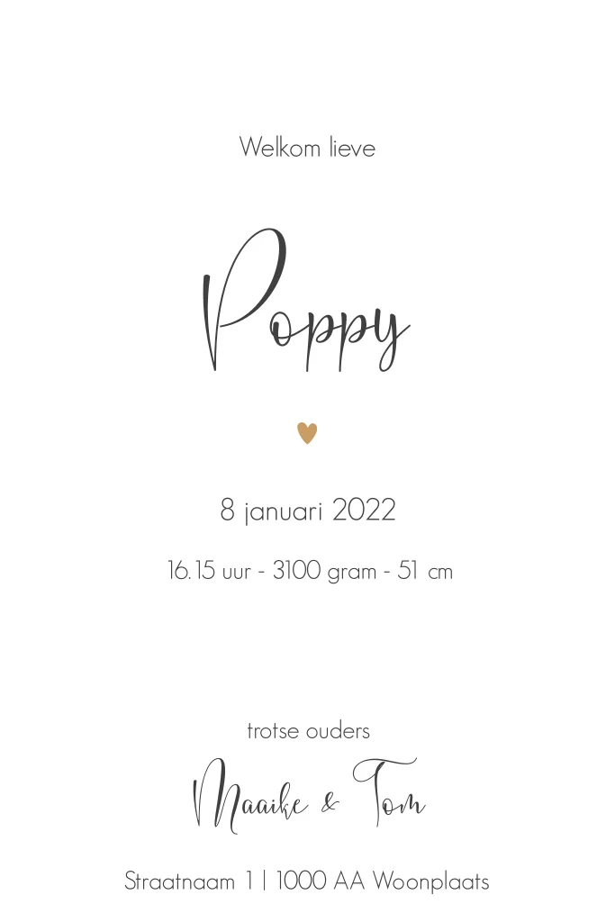 Lief folie geboortekaartje met illustratie van vrolijk konijntje met een grote ballon. In de ballon is ruimte om de naam van jullie kindje te plaatsen. Het konijntje en de naam is in dit ontwerp uitgevoerd in goudfolie. Liever een andere foliekleur? Geen probleem! Via de editor kun je heel eenvoudig voor een andere foliekleur kiezen.