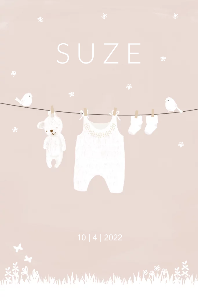 Folie geboortekaartje voor meisjes met waslijn en kleertjes