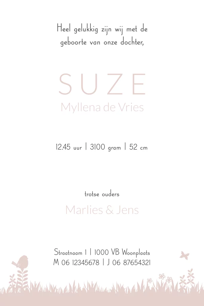 Origineel goudfolie geboortekaartje voor een meisje. De achtergrond in een mooie poederachtige roze tint. Op de voorzijde een waslijntje met een babypakje, sokjes en een teddybeer. Twee kleine vogeltjes zorgen voor een vrolijke noot! De dwarrelende bloemetjes en naam in goudfolie maken het een sprankelend geheel! Het ontwerp is helemaal samengesteld uit losse elementen, dus je kunt het makkelijk naar eigen smaak aanpassen.