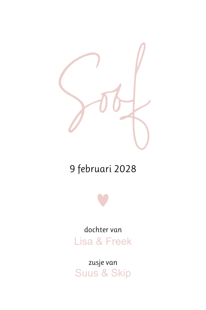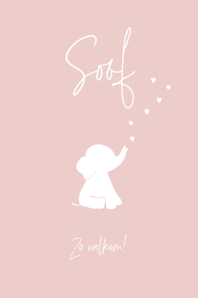 Lief geboortekaartje voor een meisje, met olifantje die hartjes blaast. Het olifantje en de hartjes zijn in goudfolie geplaatst. De kleuren van de achtergrond en de folie kun je aanpassen via de editor. Wil je iets aanpassen maar kom je er niet helemaal uit? Of wil je dat we gewoon even met je meekijken? Neem dan contact op, dan helpen we je graag! - Soof -