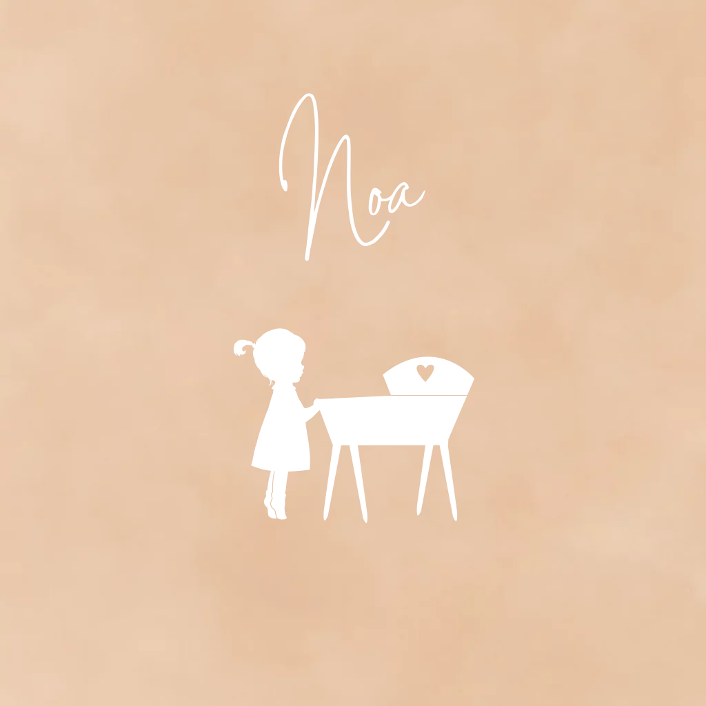 Bijzonder geboortekaartje met goudfolie. Grote zus staat op haar teentjes om naar haar zusje in het wiegje te kijken.