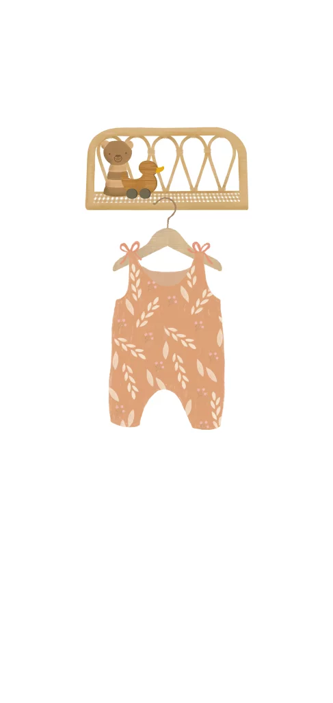 Hip geboortekaartje voor een meisje met een trendy bamboe rekje en daarop houten speelgoed. Aan het rekje hangt een hip babypakje met een leuk patroon. Het patroon komt op de achterzijde terug in omgekeerde kleurstelling.
