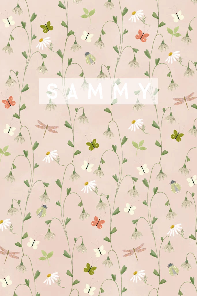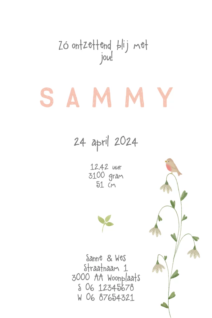 Lief geboortekaartje voor een meisje met patroon van bloemetjes, vlindertjes en insekten op een zachtroze achtergrond en de naam in goudfolie. Op de binnenzijde van het kaartje komen een paar takjes uit het patroon terug. Het patroon is helemaal opgemaakt uit losse elementen. Vind je het te druk dan kun je zelf eenvoudig een aantal takjes of vlinders weghalen. Heb je hier hulp bij nodig? Laat het ons weten, dan helpen we je graag! - Sammy -