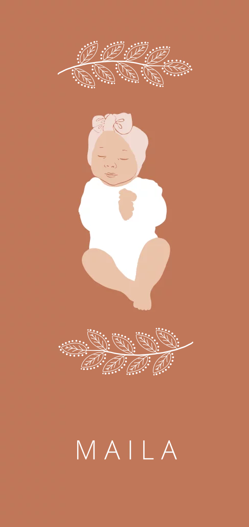 Origineel geboortekaartje voor een meisje met illustratie van babymeisje met een bandana en strik. Twee bohemian takjes in roséfolie geven dit kaartje een classy look.