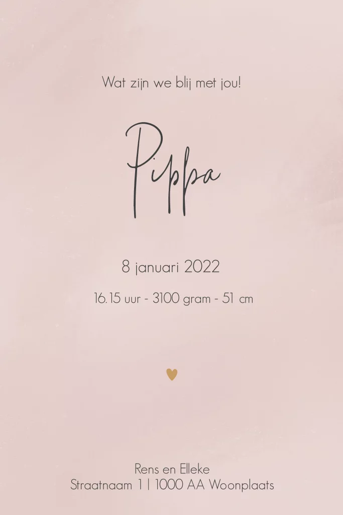 Rustig en klassiek meisjes geboortekaartje met naam en takje in goudfolie. De oudroze achtergrond heeft een geverfde structuur. De folie kleur kun je eventueel aanpassen naar zilver, koper, rosé of zwart folie.