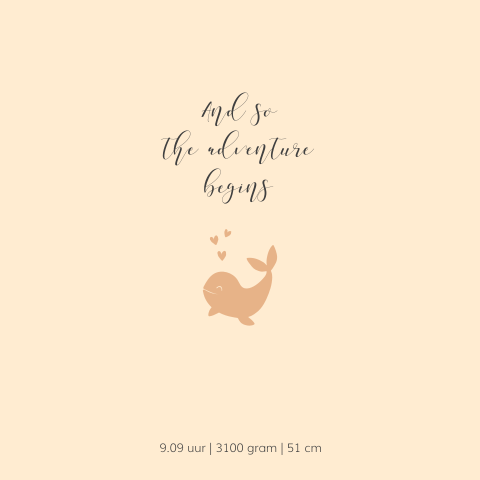 Lief geboortekaartje voor een meisje met walvisje in mooie lichte terra kleuren. Het walvisje, de hartjes en de naam zijn nu uitgevoerd in goudfolie. Natuurlijk kun je ook voor andere foliekleur kiezen via onze handige editor.