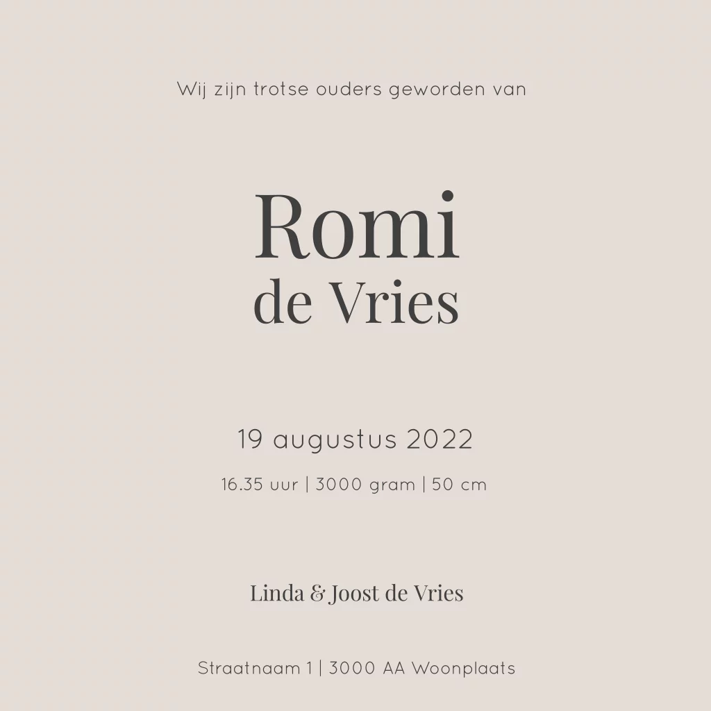 Minimalistisch en rustig folie geboortekaartje voor een meisje. Zandkleur achtergrond met de naam en zonnetje in rosé folie. Meer heeft dit ontwerp niet nodig!