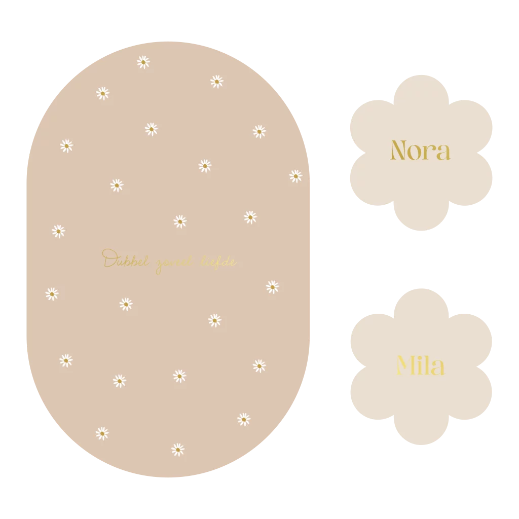 Origineel geboortekaartje in ovale vorm met twee losse bloemenlabels die je met een mooie paperclip aan het kaartje kunt bevestigen - Nora en Mila -
