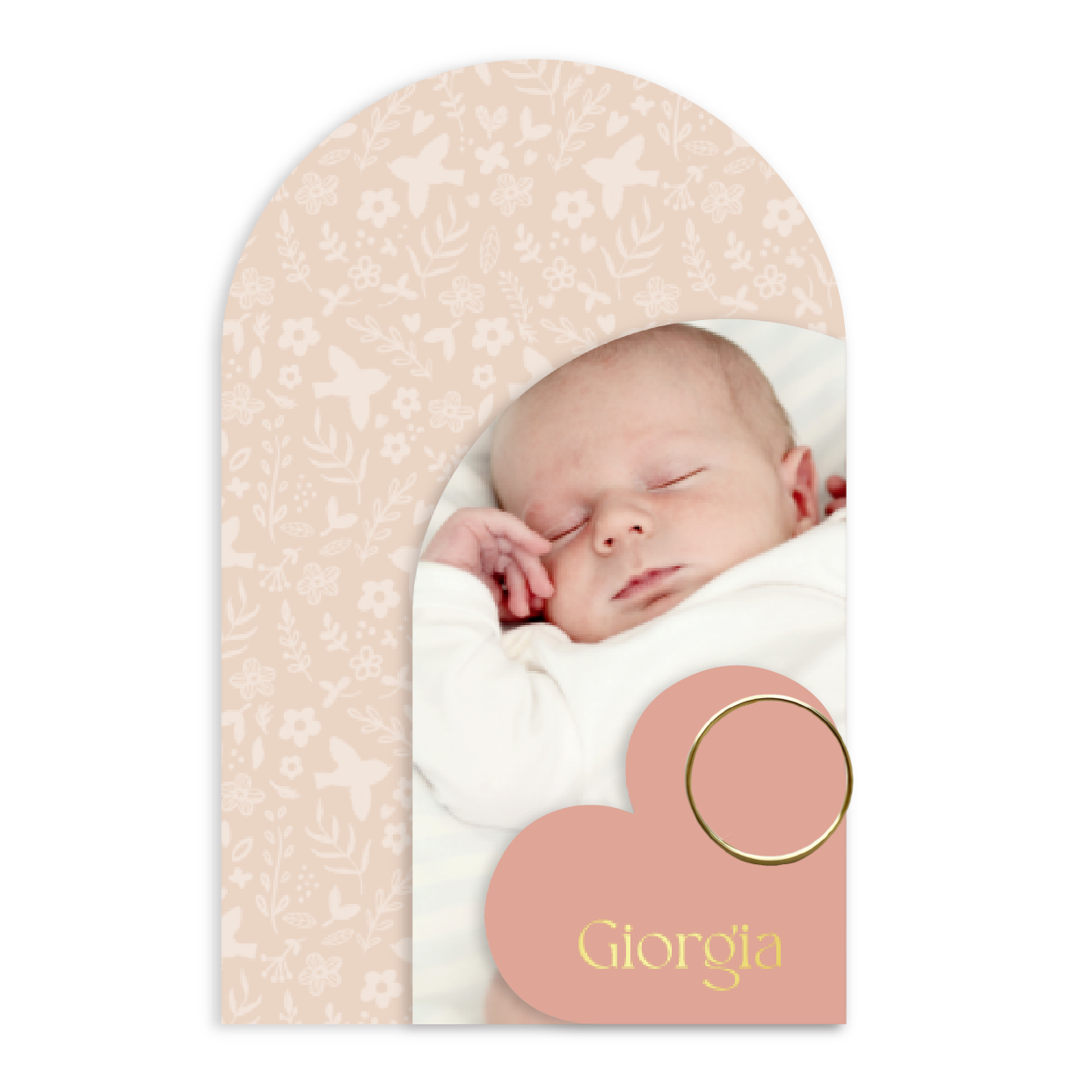 Originele labelkaart met boogvorm en hartjeslabel. Op de basiskaart een lief patroon met takjes en vogeltjes. Op de halve boog komt een mooie foto van jullie kleintje! De labels kun je met een mooie paperclip aan elkaar bevestigen. Deze worden niet standaard meegeleverd. - Giorgia -