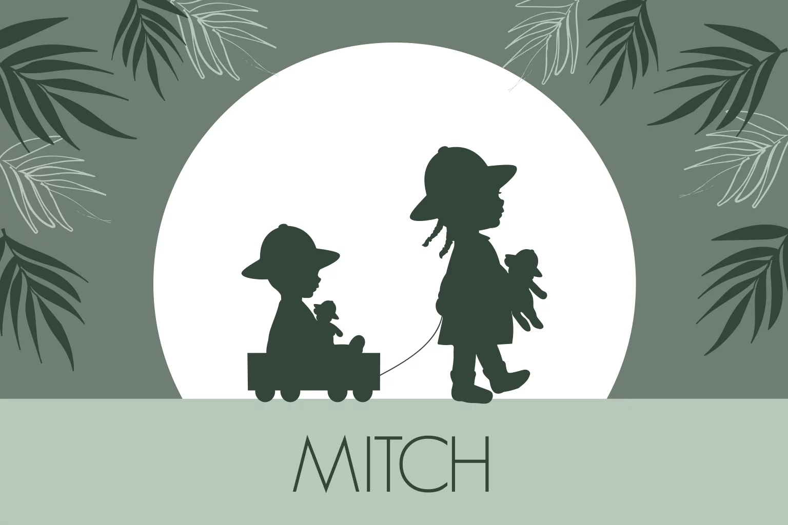 Avontuurlijk geboortekaartje met silhouet van grote zus met haar kleine broertje in een wagentje achter zich aan. De kindjes hebben tropenhelmen op en de groentinten en de tropische bladeren maken het junglethema helemaal af.