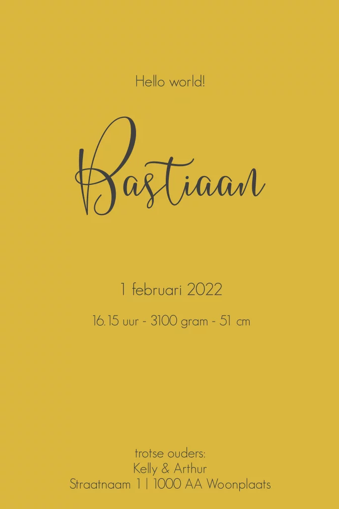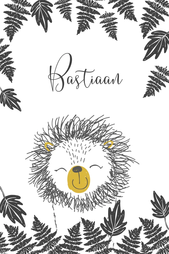 Avontuurlijk geboortekaartje voor een jongen met tropische bladeren en handgetekende leeuw. De achtergrond op de binnenzijde is in okergeel wat een mooi contrast geeft met de zwart-witte buitenzijde van het kaartje.