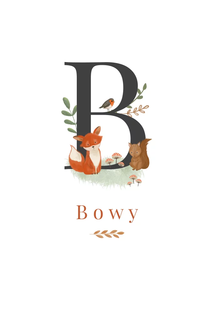 Lief babykaartje voor een jongen met op de voorzijde de eerste letter van de naam met bosdieren, takjes en paddenstoelen.