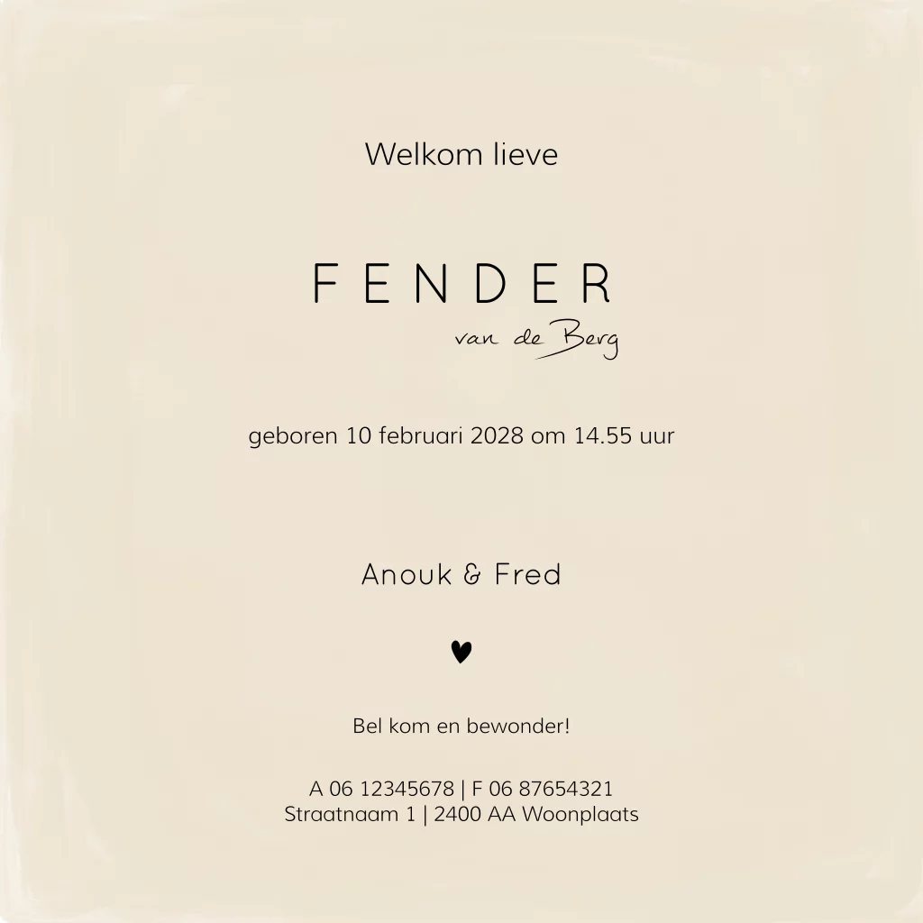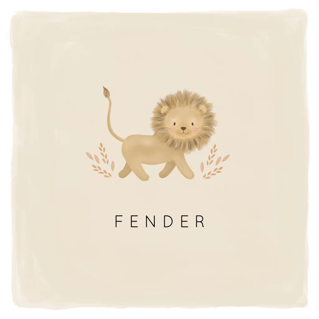 Eenvoudige geboortekaart met zandkleurige watercolour achtergrond en illustratie van een vrolijk leeuwtje. Ook dit ontwerp kun je helemaal naar wens aanpassen met onze handige editor. - Fender -