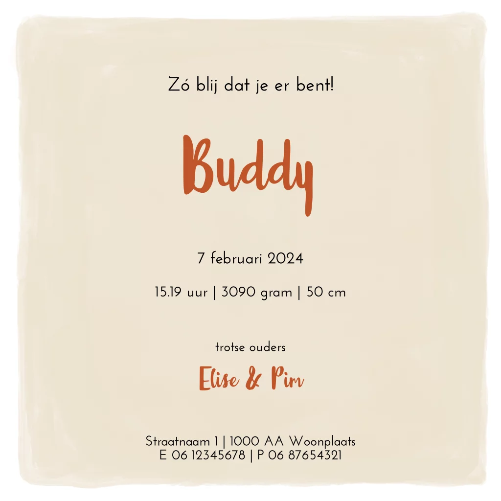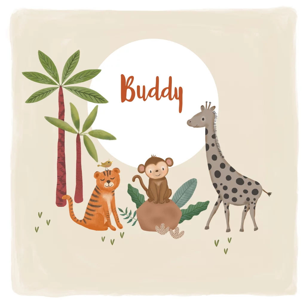 Geboortekaartje in jungle sfeer. Leuk geboortekaartje voor een jongen met zandkleurige watercolour achtergrond met jungledieren. Het kleine aapje speelt de hoofdrol in dit kaartje! - Buddy -