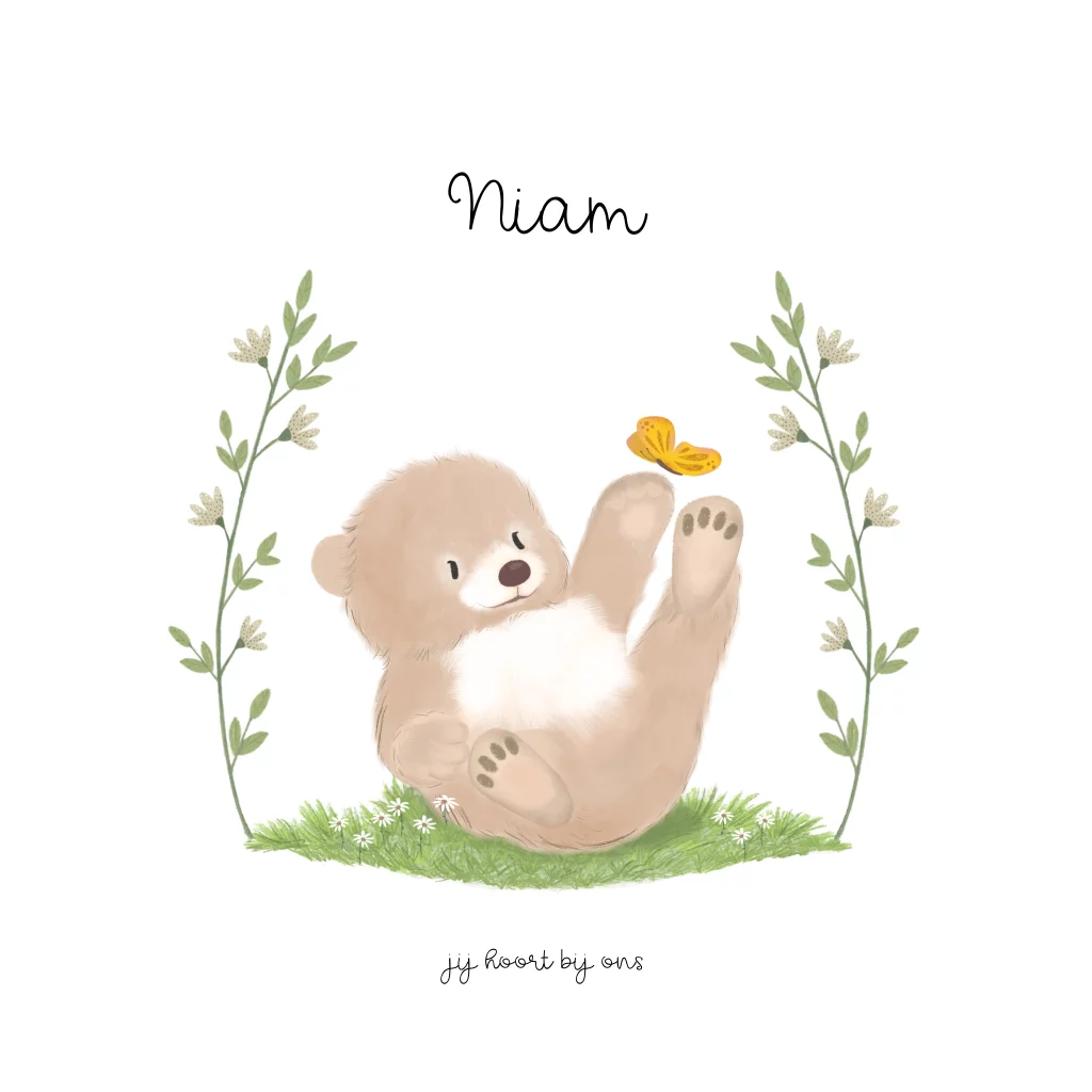 Lief geboortekaartje met ronde hoeken en illustratie van een spelend beertje in het gras.
